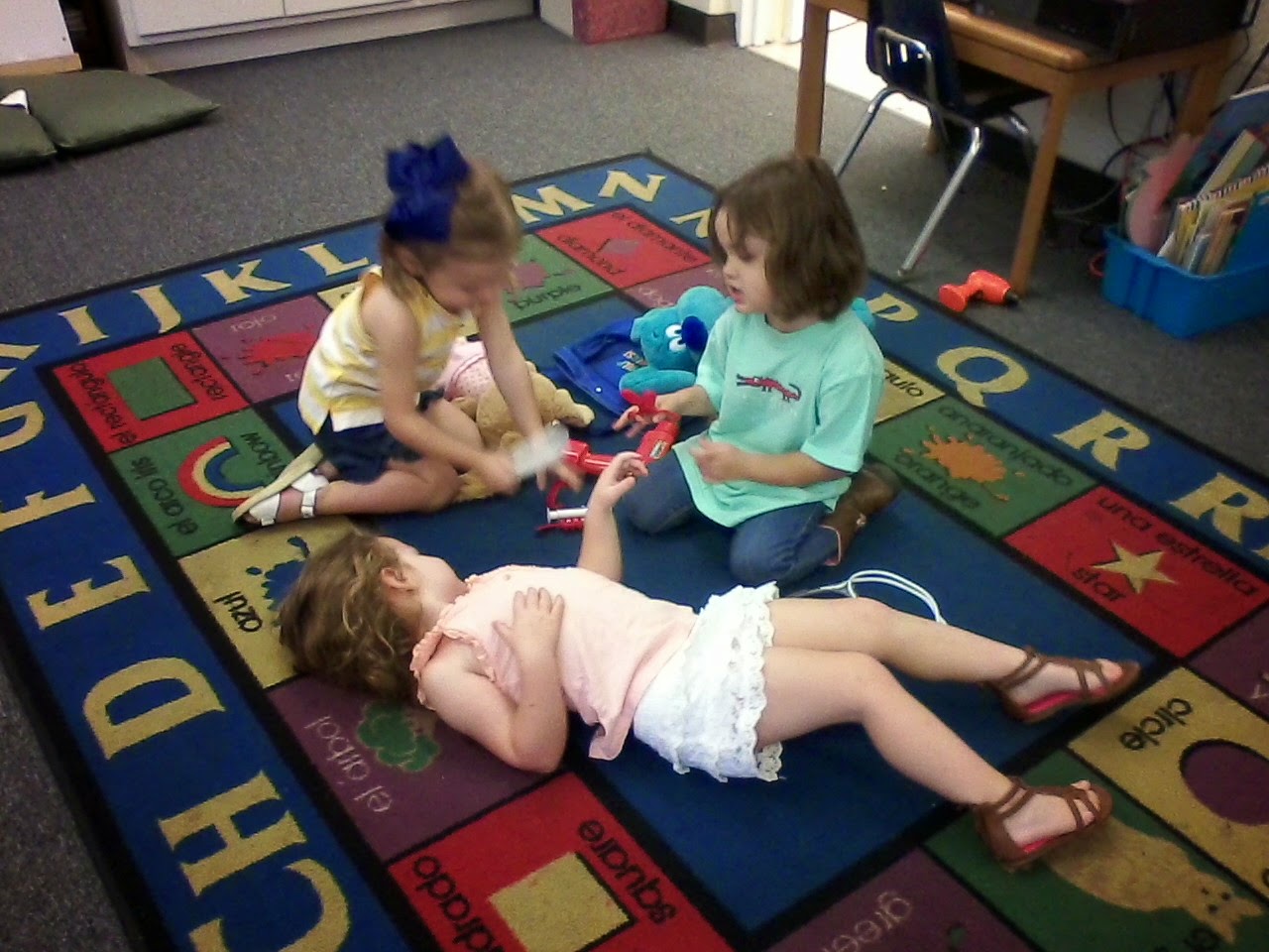 We continue to explore and learn in our Block Center and Dramatic Play Center. Today, we pretended to be doctors. Some of us even pretended to be veterinarians. We also doctored on Ms. Kim. She had a hurt leg, so we gave her plenty of shots and hugs to make her feel better.